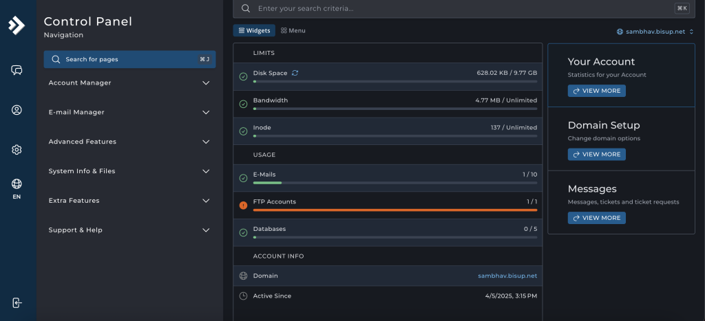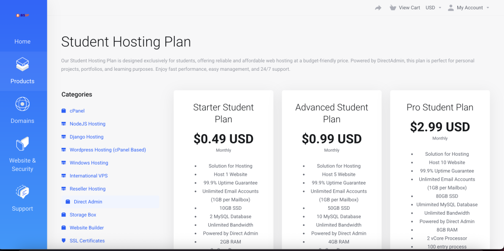 BISUP’s Student Hosting Plan isn’t just another hosting package—it’s built with students in mind. Powered by DirectAdmin, a user-friendly control panel, it’s easy to navigate even if you’re new to web hosting. Here’s what you get: